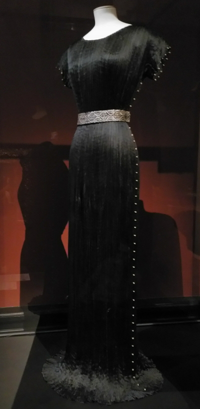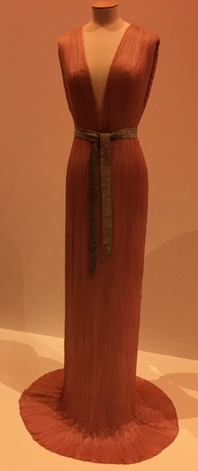 Se, mitä näyttelyltä saattoikin odottaa, on perusteellinen paneutuminen Delfoi-pukuihin, Fortunyn tunnetuimpaan muotiluomukseen. Sen esikuvana on toiminut pääasiassa antiikin Kreikan kitonin tiheä poimutus, joka myötäilee vapaasti vartaloa. Toisaalta Delfoin voidaan katsoa olevan hieman myöhäsyntyinen vastine artistic dress, reform dress ja tea gown nimillä tunnetuille puvuille, joita käytettiin ilman korsettia 1800-luvun lopulla ja 1900-luvun alussa mutta jotka eivät saavuttaneet suosiota suuren yleisön muotipukuina. Fortuny ei ollut aikalaisten muodinluojien keskuudessa yksin antikisoivine ajatuksineen, vaan näyttelyn kuvat kertovat myös Paul Poiret’n ja Madeleine Vionnet’n vastaavanlaisista pukeutumisideoista. Fortunyn pliseeraustapa ja pukujen saumojen käsittely on kuitenkin ainutlaatuinen 1900-luvun muodissa.