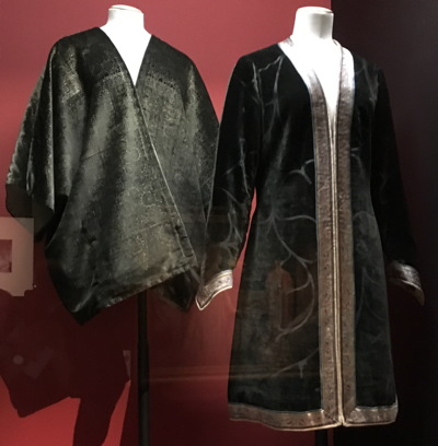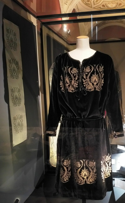 Maalaustaiteen lähitarkastelussa taiteilija kiinnitti tietenkin huomiota myös vaatteiden kuviointiin ja rakenteisiin, joiden mukaelmat siirtyivät hänen omiin pukusuunnitelmiinsa. Syntyi upeita, usein kultavärillä painettuja silkkisametteja, joista näyttelyssä on paloja, kokonaisia kangaspaneeleja sekä valmiita pukuja ja takkeja. Joidenkin kuvioiden alkuperä on jopa tunnistettavissa italialaisen renessanssin muotokuvista. Fortuny oli erityisen viehättynyt renessanssin aikana käytössä olleeseen tapaan korvata osa vaatteen saumoista nyörikiinnityksellä, jolloin alla oleva vaate näkyi kappaleiden välistä. Tästä rakenneratkaisusta Fortuny teki omia sovelluksia, joista näyttelyssä on useita esimerkkejä, ja alta näkyvänä pukuna on tietenkin Delfoi, kuten myös joidenkin muun tyyppisten samettitakkien kanssa.
