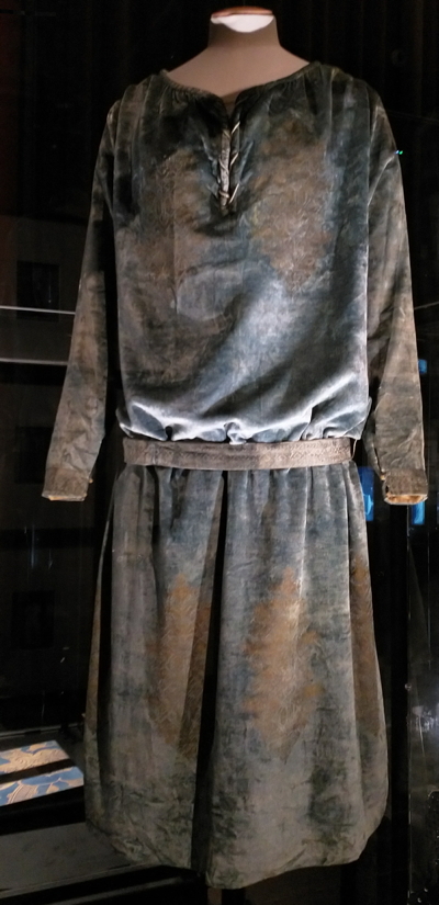 Kangaslaatujakin on esillä kolme: silkkitafti, silkkisatiini sekä harvinaisempi puuvilla. Ja vaikka moninainen luonnonväreillä värjääminen on museoista ja kirjoista tuttu, useat puvut ja värinäytteet samassa tilassa ovat todella vaikuttavia. Värivaikutelmien aistimista olisi vielä parantanut, jos edes yksi puku olisi ollut esillä keskilattialla ilman vitriiniä. Silloin pukua olisi voinut kiertää ja katsella vaikutelmaa valon tullessa eri suunnista, sillä nämä puvut on tehty elämään ja välkehtimään valossa.