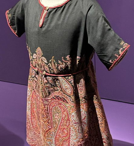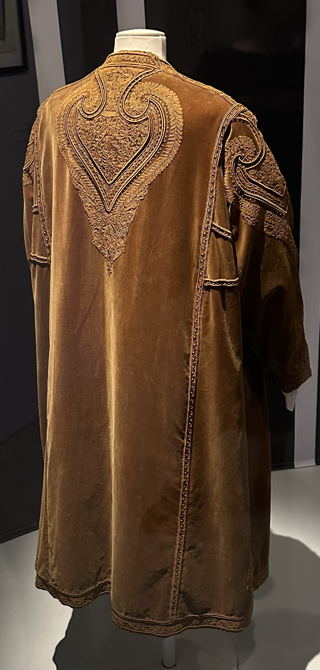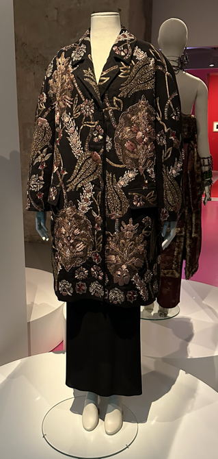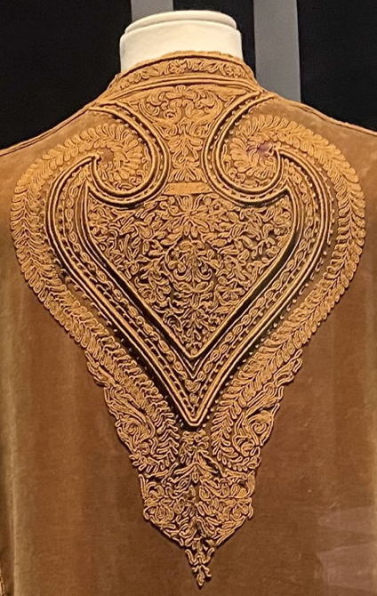 Kirjonta kiertää takin jokaista reunaa hihansuita myöten, mutta runsaimmillaan se on hihojen yläosassa, etukappaleiden yläosissa kohti olkapäätä ja ennen kaikkea selässä, missä eripaksuiset nyörit ja koko kuvio pääsevät parhaiten esiin. Kirjonta-aihe ja -tekniikka saattavat olla peräisin Iranista tai Uzbekistanista, missä Poiret itse ei milloinkaan käynyt, mutta vaikutteethan kulkeutuvat myös toisen käden kautta. Joka tapauksessa alunperin Deniselle suunnitellusta takista tuli myyntimenestys vuonna 1908, ja sitä valmistettiin myös muun värisenä. Se on ehdottomasti yksi näyttelyn helmiä, ja se on innostanut kahtakin tutkijaa perehtymään tyylin alkuperään.