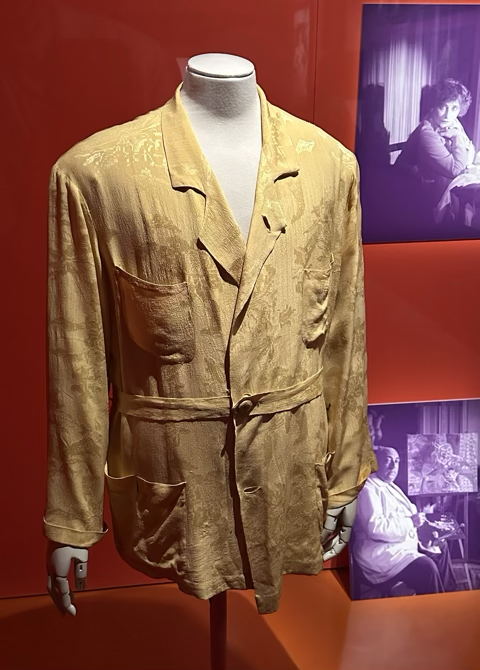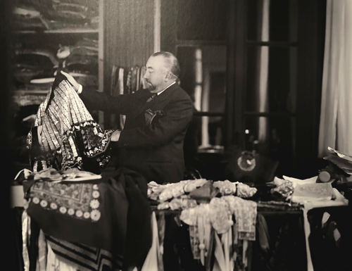 Tähän henkilökohtaiseen osioon sopii hyvin myös pari Poiret’n omaa takkia. Ensimmäinen on työtakki, jota Poiret on käyttänyt vuosina 1915–1925. Muodoltaan se ei ole kovin erikoinen miehen takiksi mutta materiaaliltaan sitäkin erikoisempi. Se on keltaista silkkikreppiä, jossa on damastikuvioita. Couturier on usein kuvattu työnsä ääressä, mutta kuvissa työtakki näyttää tavallisemmalta valkoiselta puuvillatakilta tai sitten hänellä on yllään sovinnainen miesten puku, kuten tässä alempana kankaiden ääressä.