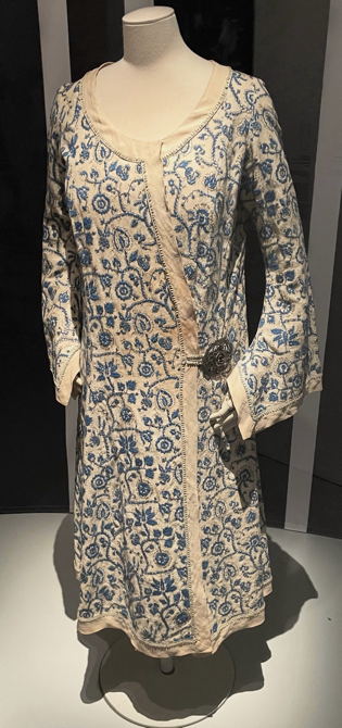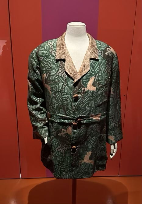 Toinen Poiret’n oma takki vuodelta 1920 on pellavakangasta, jonka painokuviot on toteutettu puulaattapainantana. Kaulus on silkkiä ja nahkaa. Painokankaan suunnittelusta on vastannut Atelier Martine, joka valmisti kankaita myös muihin pukuihin ja ennen kaikkea Poiret’n tilaamiin sisustuskankaisiin, jotka jätän tämän tekstin ulkopuolelle.