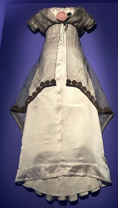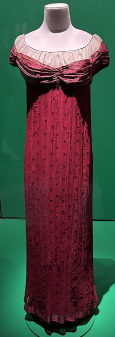 Edellä olevat kuvat ovat ikävä kyllä siinä mielessä epärealistisia, että niiden esittämät keskeiset vaatteet on aseteltu näyttelyssä vaakasuoralle pinnalle eikä nuken päälle. Nyt ne leviävät liikaa helmaa kohti. Levenevä helma on tietenkin ollut hyvä liikkumisen kannalta, mutta ei tavoitellun vaikutelman mukainen. Jos puvut olisivat siinä asennossa, jossa niitä on käytetty, kävisi selväksi myös se tämän tyylin piirre, että pukujen sivut ovat aivan suoria, kohtisuoraan alas laskeutuvia pienestä väljyydestä huolimatta. Heti rintojen alla tai pallean kohdalla oleva poikkilinja ja muuten pylväsmäinen yhtenäinen linja muistuttavat siinä määrin 1700–1800-lukujen vaihteen uusklassista muotia, että 1910-luvun muotia on joskus kutsuttu ”toiseksi empireksi”.