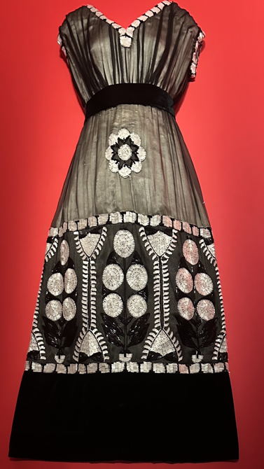Mustavalkoinen iltapuku vuodelta 1910 on silkkisatiinia, -sifonkia ja -samettia. Samoin kuin puvun kokonaismuoto, joka vastaa pääpiirteissään edellisen puvun yksityiskohtia, myös valkoinen lasiputkikirjonta tekee eroa menneisyyteen ja osoittaa uuden art decon piirteitä. Sen geometrisuus on näennäisen yksinkertaista mutta runsasta ja ylellistä.