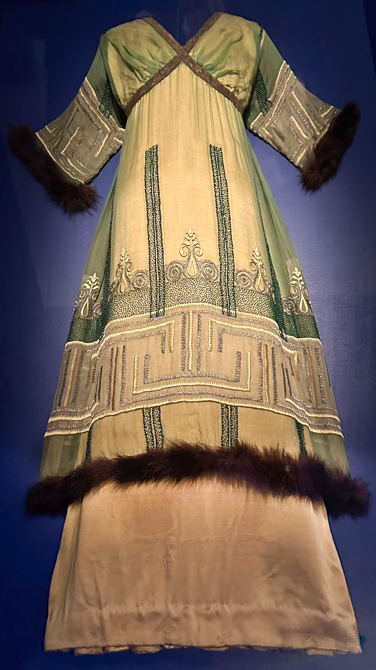 Iltapuku on vuodelta 1907. Sen pääosa on silkkisatiinia, mutta se ei ole ollenkaan pääosassa. Satiinin päällä on ikään kuin toinen ohut silkkiverkosta muodostuva vaate. Sen helman kirjonta vaikuttaa yksinkertaiselta, mutta se on erittäin työlästä kohokirjontaa, jossa pohjuslanka – tässä tapauksessa metalilankanyöri – päällystetään tiheillä, pohjan peittävillä pistoilla silkkilangalla (points de bourdon). Kirjonta on tämän puvun erikoisuus, mutta muut piirteet suuntaavat tulevaisuuteen luoden tyypillistä 1910-luvun linjaa: Puku on suora kuin pylväs, vyötärön kohta ei näy lainkaan. Yhtenäisen linjan katkaisee vain rintojen alapuolella oleva sauma (tai jos ei sauma, niin ainakin tätä kohtaa korostava vyö). Olkalinja on pehmeä. Hihat on todennäköisesti leikattu samasta kappaleesta miehustan kanssa ”kimonotyyliin”, eli hihan kiinnityssaumaa ei ole tai ei ainakaan näy. Puvussa on kaksi helmaa: varsinaisen puvun runko-osan helma täyspitkänä ja tunikamaisen päällysosan helma selvästi ylempänä.