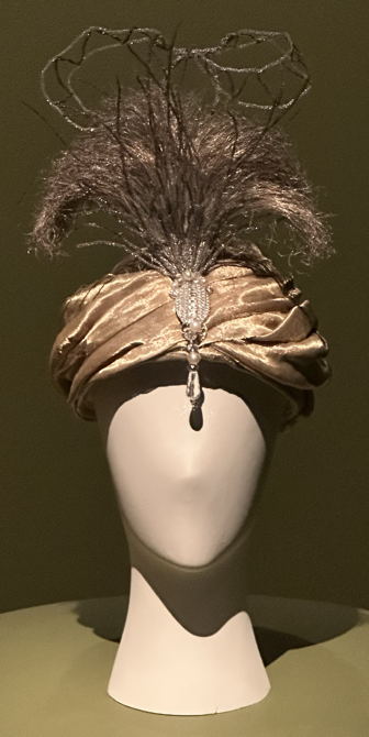 Turbaanit olivat suosittuja asusteita ja ”itämaisten” kokonaisuuksien osia. Ruskeasta silkkisatiinista kiedotussa turbaanissa on vastaava idea kuin vihreän puvun turbaanissa, mutta yksityiskohdat näkyvät paremmin: edessä silkkikerrokset on koottu korun alle. Siitä laskee alas lasipisara. Ylöspäin taas nousee strutsinsulkatöyhtö ja tässä tapauksessa vielä jäykkä metallilankakoriste.