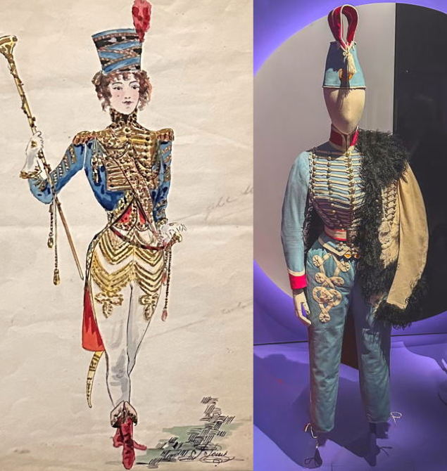 Kaksi näistä piirroksista on esillä näyttelyssä kauniisti kehystettyinä. Hyvä että ovat, mutta harmi ettei varsinaisia pukuja ole. Ensimmäisen kuvan alla lukee ”LASSITUDE Paul Poiret’n päivällispuku”. Kuva julkaistiin Gazette de Bon Tonissa 1912.