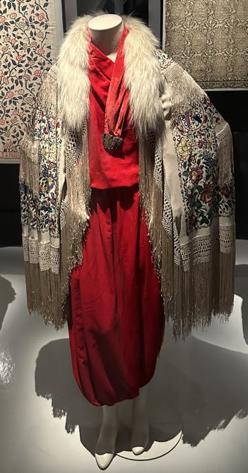 Punainen haalaripuku huiveineen on huippuesimerkki useiden eri tahoilta saatujen vaikutteiden synteesistä. Haalari-iltapuku vuonna 1911 oli erikoisuus. Haaremihousuja oli nähty jo ennen tätä pukua, mutta tähän ovat voineet vaikuttaa myös Ballet Russen tanssiasut (venäläinen baletti Pariisissa 1909–1929). Tämä puku on kuitenkin valmistettu tyypillisistä iltapukumateriaaleista: silkkisametista ja -musliinista. Huivimaisen kauluksen päässä on vielä nyörikoriste.