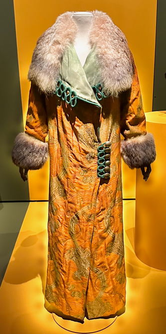Kirkkaan oranssi takki vuodelta 1910 on erittäin arvokasta hienoa silkkidamastia (gros de Tours). Tässä kankaassa osa kuvioista muodostuu samasta oranssista silkkilangasta kuin taftimainen pohja ja osa kulta- ja hopealangasta. Yläosan käänteissä näkyy vaaleanvihreä taftivuori. Valtava kaulus ja hihansuut ovat pitkäkarvaista turkista, ehkä kettua, mutta sitä ei mainita tiedoissa. Poiret oli mielistynyt turkiksiin ja käytti niitä joskus puvuissakin, kuten minkkireunus Mosaïque-puvussa edellä. Ehkä juuri valtava turkisosuus on saanut Poiret’n pitämään tätäkin takkia orientaalisena. Kankaan nimi kylläkin viittaa Toursin kaupunkiin, joka on mitä ranskalaisinta Ranskaa, maan keskellä Loire-joen laaksossa.