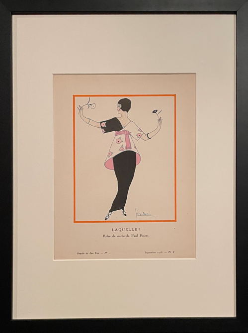 Vuonna 1913 samassa lehdessä julkaistun toisen kuvan alla lukee ”LAQUELLE? Paul Poiret’n iltapuku”. Puku, jonka yksinkertaiset helmikirjonnat muistuttavat suurikokoisia marjoja, kuitenkin tunnetaan paremmin nimellä ”Sorbet”. Alkuperäisen puvun Poiret suunnitteli vaimolleen Deniselle ehkä kuuluisimpaan juhlaansa ”Mille et Deuxième Nuit” eli tuhannen ja toisen yön juhlaan vuonna 1911. Silloin puvussa oli haaremihousut. Myöhemmin puku tuli haute couture -kokoelmaan, ja silloin siinä oli housujen tilalla täyspitkä hame, edestä jonkin matkaa laskostettu ja takana pieni laahus, jota ei piirroksessa näy. Puvusta on jäljellä ainakin kolme kappaletta, kaksi Yhdysvalloissa ja yksi V&A:ssa Lontoossa. Siksipä olikin harmi, että tätä ehkä kuuluisinta pukua ei ollut näyttelyssä. Toisaalta se on ymmärrettävää, sillä ainakin V&A:n puvun satiinimiehusta vaikuttaa lähikuvassa melko hauraalta.