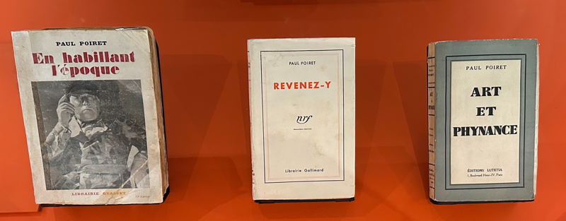 Paul Poiret oli itse ahkera kirjoittaja ja julkaisi monenlaisia teoksia. Herkuttelijana ja innostuneena ruuan valmistajana hän julkaisi vuonna 1928 omia ruokaohjeita piirroksin kuvitetussa kirjassa ”107 recettes ou curiosités culinaires”. Tästä kirjasta esitetyt pienet näytteet olivat tietenkin aivan sivuosassa, samoin kuin muutkin kirjat. Vuodesta 1930 alkaen Poiret julkaisi kolme muistelmateosta. Tunnetuin näistä on ensimmäinen ”En habillant l’époque” (”Aikakauden pukeminen”). Se ilmestyi alunperin vuonna 1930, jolloin hänen menestyksensä oli jo hiipunut. Kirjassa Poiret kertoo elämästään nuoruudesta saakka, ja tietenkin muotiurastaan mutta myös Pariisista ja sen erilaisista puolista. Hän oli yksi harvoista suurista couturiereista, joka oli syntynyt ja kasvanut juuri Pariisissa. Teos oli myyntimenestys, ja näyttelyssä oleva alkuperäiskappalekin näyttää kunnosta päätellen moneen kertaan luetulta. Sivumennen sanoen – teosta painetaan ja myydään edelleen, ja se on myös käännetty myös englanniksi kahdella eri nimellä: ”King of Fashion” ja ”My first fifty years”.
