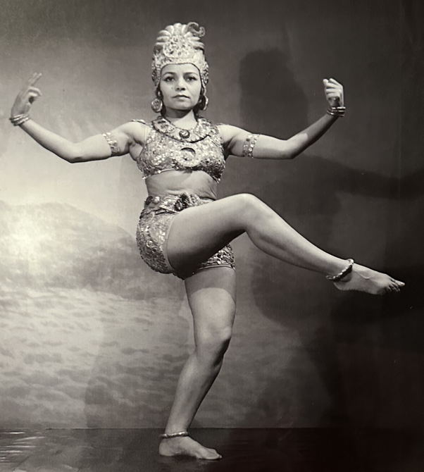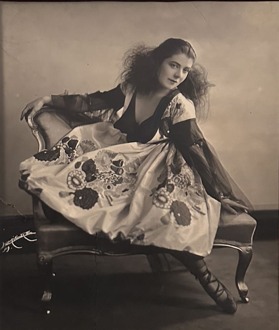 Yksi esimerkki Poiret’n organisoimasta tanssitapahtumasta oli l’Oasis–salissa vuonna 1921. Natalia Gontcharova oli taiteellinen johtaja, Muolle Rossignol puvustaja ja tanssijatar Caryathidis esitti ”Espanjalaisen tanssin” varsin omaperäisessä puvussa. Ainakin kuvassa se muistuttaa enemmän edellä olevaa Gontcharovan maalausta kuin tanssipukua. Jos ei näyttelypuvusta näkyisi käsivarsia, sitä voisi luulla taiteilijan installaatioksi. Puvun pääosa on silkkisatiinia, mutta se on varsinainen materiaalien yhdistelmä: käsin ja koneella kirjottua kangasta, tylliä, nauhaa, puuta ja maalattua puuvillakangasta. Puku on ollut aikanaan avantgardistinen – ja on sitä edelleenkin.