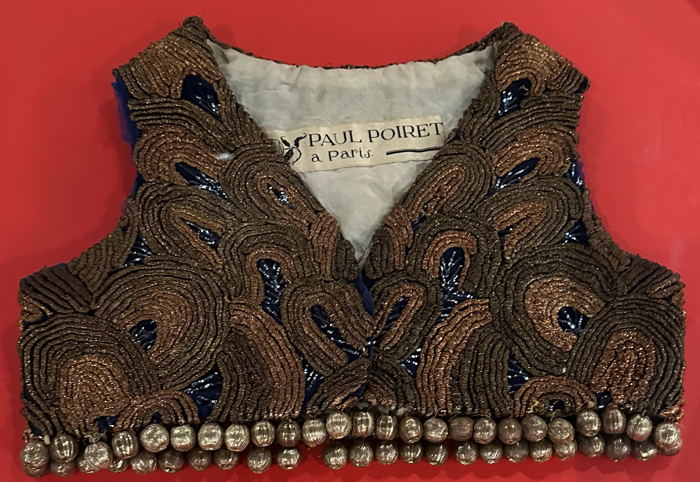 La Source (Lähde vuodelta 1924) on sekin omalaatuinen iltatakki ensinnäkin siinä mielessä, että tässä näyttelyssä se vaikuttaa melko tavalliselta eikä kovinkaan Poiret’lle tyypilliseltä. Mutta lähitarkastelu on taas tarpeen, sillä kuva ei kerro heti kaikkea. Ottaen huomioon, että kyseessä on takki, pääntie on epätavallisen avara. Hihansuiden kulmikas muotokin näkyy kuvasta. Aivan erityistä tässä on materiaali: Pohjakangas on puuvillapalttinaa. Sitä on koristeltu konekirjonnalla, mikä 1920-luvun haute couture -talossa oli vielä harvinaista. Myöhemmin konekirjottuja kankaita on kyllä nähty. Tässä kirjontaan on käytetty ohutta kultalankaa ja paksuhkoa sinistä puuvillalankaa. Kaikkia reunoja kiertää pohjakankaan värinen kaitale. Ainoana erikoisyksityiskohtana on suuri metalliseppä Paul Kissin valmistama hopeoitu nappi ja sen nyörisilmu. Koska kiinnitys on toispuoleinen, hieno nappi on vaarassa jäädä vasemman hihan alle näkymättömiin./