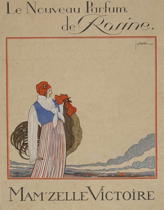 Jo aiemmin mainittu muotipiirtäjä Georges Lepape taas suunnitteli seuraavana vuonna 1916 julisteen, jolla mainostettiin Mam’zelle Victoire -parfyymiä.