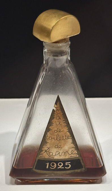 Viimeinen hajuvesiaiheinen näyttelyesine on yksinkertaisen tyylikäs kolmionmuotoinen pullo, jonka etiketissä lukee: Eau de toilette de Rosine. Se on vuodelta 1925. Tuona vuonna Poiret’n uralla tapahtui vielä paljon. Hän suunnitteli mm. puvustuksia ja perusti edellä mainitun”Martine”-osakeyhtiön, mutta sen jälkeen Poiret’n tähti lähtikin laskusuuntaan, vaikkaan ei sammunut äkillisesti.