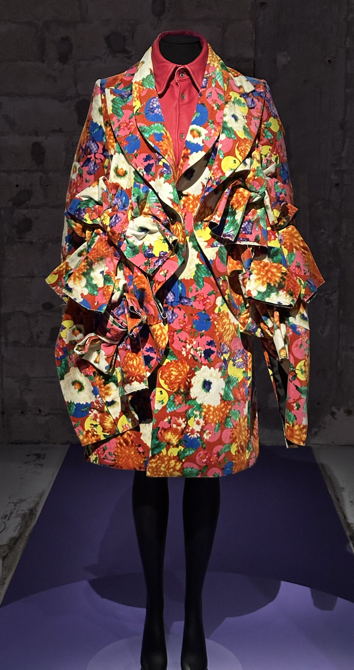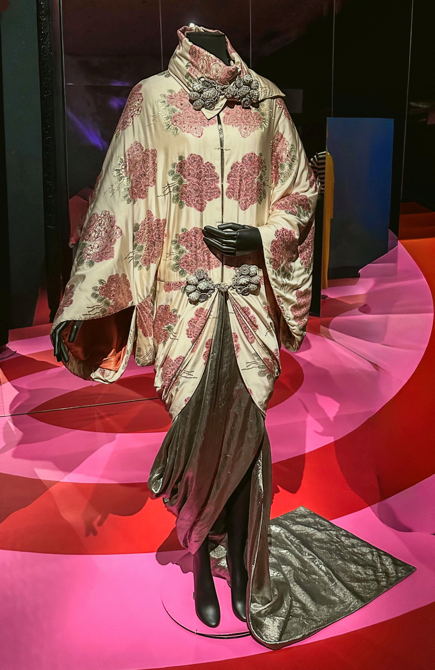 John Gallianon Diorin kevät-kesäkokoelmaan 1998 suunnittelema iltatakki ja pukuyhdistelmä on vaikutteiltaan ehkä ilmeisin leveine hihoineen ja nyöreineen. Pukua tuskin näkyy, mutta takki sitäkin paremmin. Se on käsin maalattua silkkibrokadia. Etureunat pysyvät vastakkain pienillä hakasilla, mutta näyttävin kiinnitys on kauluksessa ja vähän vyötärön alapuolella, missä on rykelmittäin verkolla päällystettyjä harmaita palloja ja nyöriapplikaatiota. Kummassakin kohdassa myös koristeellinen nappi kiinnitetään nyöristä punotulla silmulla.