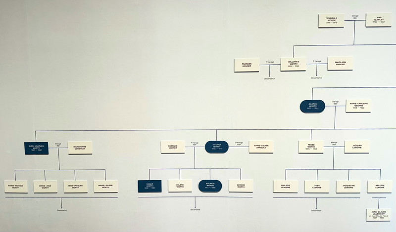 Näistä alkuvaiheista ei ole jäljellä mitään vitriineissä näytettävää. Asiat olivat enimmäkseen esillä seinillä olevissa harvoissa kuvissa ja tekstitauluissa. Marie Vernet’stä oli sentään muotokuva. Sekin on tosin maalattu jo vuonna 1845, siis vähän ennen kuin pariskunnasta tuli työtovereita. Aviopari heistä tuli vuonna 1851. Ruotsalainen liikemies Otto Bobergh taas oli liikekumpani 12 ensimmäisen vuoden ajan, ja yrityksen nimi olikin Worth & Bobergh aina vuoteen 1870 saakka, jolloin tiet erosvat. Omasta perheestä kuitenkin löytyi liikekumppaneita, sillä Worthin lapsista pojat Gaston (1853–1924) ja Jean Philippe (1856–1926) jatkoivat alalla; Jean-Philippe suunnittelijana ja Gaston taloushallinnossa. Hän oli myös keskeinen toimija koko alan organisoitumisessa, millä oli erityisesti tarkoitus estää ja valvoa kopiointia.