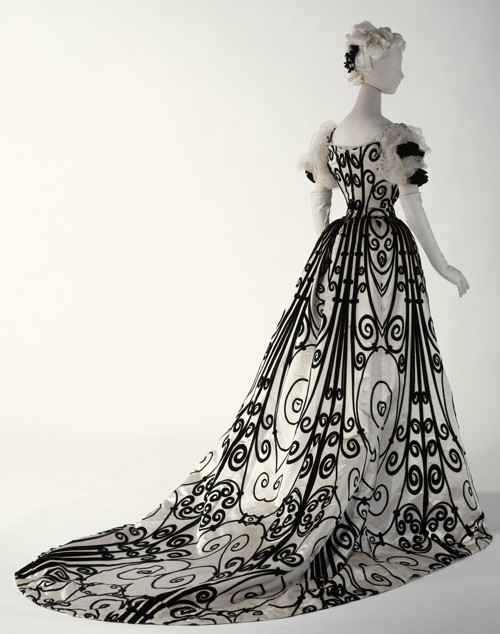 Jos edellä esitellyssä puvussa leikkaus ja kuvioiden käyttö ovat huippuluokkaa, niin se kertoo taidosta nähdä yli ja ohi sen, mitä pakalla on. Tämän puvun kangas taas on kudottu à la disposition, eli Worthin antaman kaavan mukaan. Kangasta on siis suunniteltu yhtä aikaa puvun kanssa. Taitavasti tässäkin saumat on ommeltu siten, että valkoisella satiinipohjalla olevat mustat samettikoukerot muodostavat yhtenäistä pintaa, mutta idea on siinä, että kuviot kapenevat leveästä laahustavasta helmasta kohti kapeaa vyötäröä, mikä on harvinaista jopa muodin huipulla.